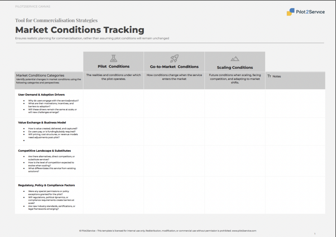 To address this, we developed the Market Conditions Tracking Canvas. It helps teams monitor how external conditions shift as they move from pilot to broader implementation. This tool supports proactive planning instead of reactive problem-solving.